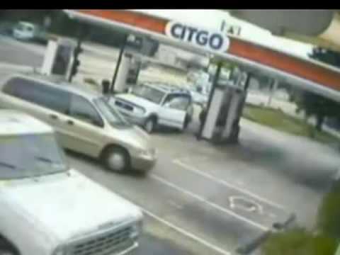 Mailman drop off at an office near a gas station leaving the truck with brakes off. He was lucky, watch how the truck went back in a circle and rotate and almost hit a gas unit.